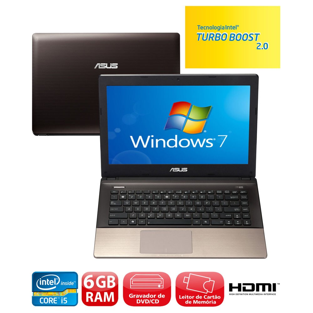 Esse é o notebook Asus K45A-VX112Q, um dos notebooks mais recentes do mercado, equipado com o processador Intel® Core™ i5-3210M de 2.50 GHz de velocidade e frequência turbo máxima de 3.10 GHz, com dois núcleos de processamento capacidade para até quatro tarefas simultâneas, excelente para usuários que procuram desempenho e produtividade máximos, com 6 GB de memória ram DDR3, que é a memória mais atual e rápida do mercado, perfeita para navegar na Internet e trabalhar com várias janelas simultâneamente, HD de 750 GB para armazenar todos os seus dados, como fotos, vídeos, músicas e muito mais, tudo isso em uma tela LED de 14" polegadas, que economiza até 35% de cores que o LCD e possui cores vivas também, perfeita para você trabalhar ou se divertir com ele.