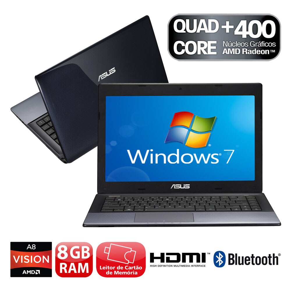 Esse é o notebook Asus K45DR-VX014R, um dos notebooks mais recentes do mercado, equipado com o processador AMD® A-Series™ A8-4500M de 1.90 GHz de velocidade e 2.80 GHz de frequência turbo máxima, com quatro núcleos de processamento capacidade para até quatro tarefas simultâneas, excelente para usuários que procuram desempenho e produtividade máximos, com 8 GB de memória ram DDR3, que é a memória mais atual e rápida do mercado, perfeita para navegar na Internet e trabalhar com várias janelas simultâneamente, HD de 750 GB para armazenar todos os seus dados, como fotos, vídeos, músicas e muito mais, tudo isso em uma tela LED de 14" polegadas, que economiza até 35% de cores que o LCD e possui cores vivas também, perfeita para você trabalhar ou se divertir com ele.