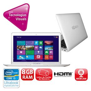 Esse é o ultrabook Qbex UX622, um dos mais leves e robustos ultrabooks do mercado, equipado com o processador Intel® Core™ i3-3217U de 1.80 GHz de velocidade, um processador com dois núcleos de processamento e capacidade para até quatro tarefas simultâneas, excelente para usuários que procuram desempenho e produtividade para seu dia a dia, com 8 GB de memória ram DDR3, que é a memória mais atual e rápida do mercado, perfeita para navegar na Internet e trabalhar com várias janelas simultâneamente, HD de 500 GB mais 32GB SSD para armazenar todos os seus dados, como fotos, vídeos, músicas e muito mais, tudo isso em uma tela LED de 14" polegadas, que economiza até 35% de cores que o LCD e possui cores vivas também, perfeita para você trabalhar ou se divertir com ele.